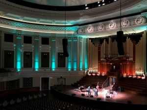 オペラハウスコンサートホールの内部。PAを使うコンサートのため、舞台後ろや、壁、床に響きを抑えるため布やカーペットが張られていた。